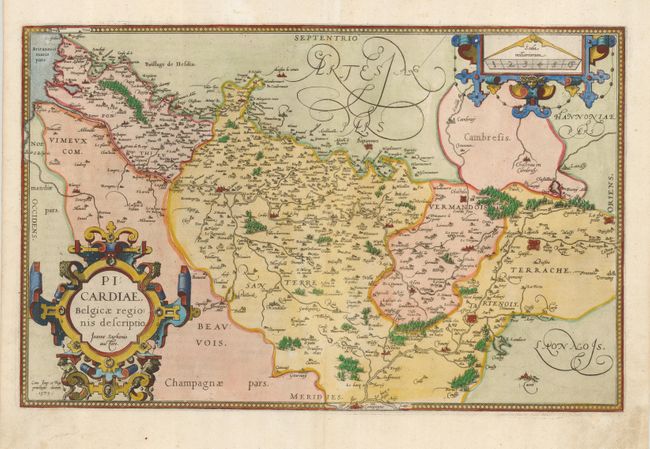 Superb example of the decorative style of Ortelius, based on the cartography of Jean Surhon. The map is filled with detail of the countryside along the Somme River, includes Abbeville, Amiens, Saint Quentin and La Fere (which was obviously a larger city in the sixteenth century than it is today). Two large and elaborate strapwork cartouches decorate the map at top and bottom. This issue was published in a Latin edition of 1579.