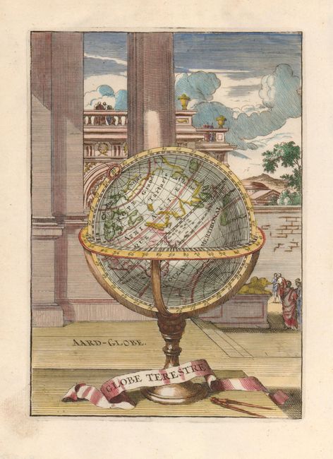 Pair of attractive illustrations of terrestrial and celestial globes; each set within a background depicting the Roman period.