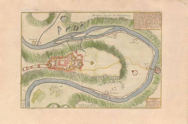 Interesting plan of the now-destroyed Mont Royal Fortress in an elbow of the Moselle River, which was built in 1687 by Marquis Vauban, architect and master builder to Louis XIV. The complex, which was razed to the ground as early as 1698, served as a supply fort for the French troops on the Rhine front and in the Palatinate region. Nicolas de Fer held the title of Geographer at Louis XIV's court. He was one of the most prolific publishers of plans of European cities in the late seventeenth century.