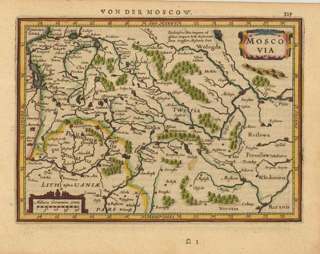 Handsome map of the region from the Gulf of Finland to Moscow. Fully engraved to show forests, rivers, lakes and cities and decorated with strapwork title and scale cartouches. German text on verso.