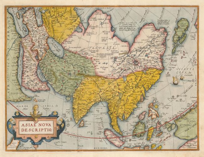 First edition of Ortelius' important map of Asia based on his wall map of 1567, which was in turn based on the work of Gastaldi and various other sources. This map was the standard map of Asia for more than forty years. The cordiform projection shows Asia extended too far to the east, an error propagated with Ptolemy. Japan is in a 'kite' form taken from Jesuit sources. Luzon is absent from the Philippines and the mythical lake Cayamay lacus is located in southern China. There are a great number of islands in the East Indies, but they are not well placed, due to the secrecy of voyages to the region. A portion of New Guinea and the Terrae Incognitae Australis pars is located at the right corner. The map is adorned with a large title cartouche. Latin text on the verso, from an early edition published between 1570-1574.