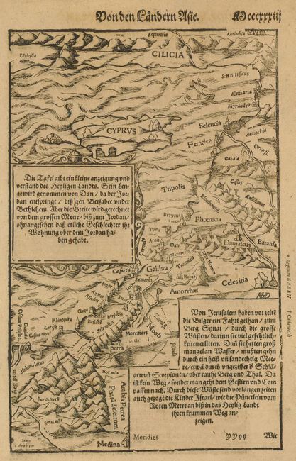 Woodblock map of the Holy Land and Cyprus, covering from southern Turkey to the Red Sea. The Jordan River is shown with two sources. According to medieval conception, the name was composed from the names of those sources: Jor and Dan. There are two inset panels of German text.