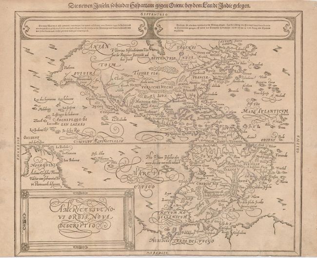 This handsome woodcut is based on Abraham Ortelius' classic map. It features the huge bulge in the southwest coastline of South America, the extensive western coastline of North America, and the great southern continent, here called Meridies Terra de Fuego. A village of Quivira and the Sierra Nevada are located in present-day California. Inland is the kingdom of Quivira with those of Anian and Tolm to the north and east. Above the map are two elongated ovals of gothic German text and above that, in the upper margin a German title, "Die newen Inseln so hinder Hispania Gegen Orient bey dem Landt Indie Gelegen." German text on verso.