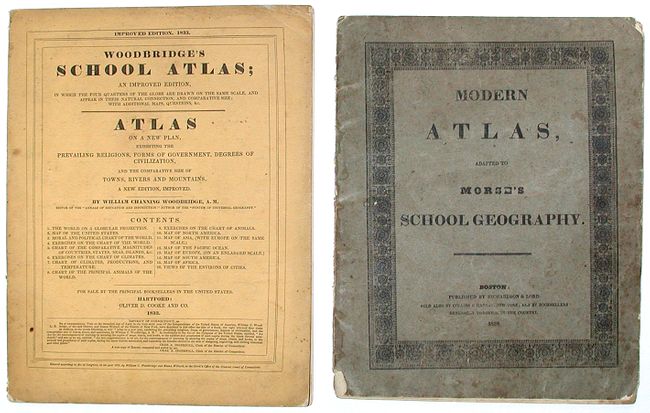 2) Woodbridge's atlas contains 9 single page and 2 double page maps. This example features a terrific, double page Geographical and Statistical Map of the United States that shows the Arkansaw Territory in its later, smaller configuration, and includes a large inset map; Northern Division of the United States that details the northeastern states from Maryland to Maine. Also included with this atlas is an interesting Moral and Political Chart of the Inhabited World… that divides the world into religious and political regions. Several notes and a key describe the populations, religions, governments and degrees of the various civilizations. Published by Oliver D. Cooke and Co., Hartford. 1833 (9.3x12"). Complete. 4to. Original paper covers. Grade B. Text and maps generally good with scattered foxing. Covers soiled and shelf-worn. Spine and binding tight and sound.
