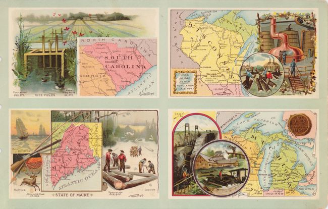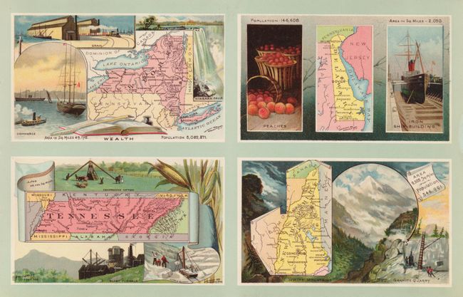 A nice example of this unusual atlas that was designed to advertise Arbuckle's Coffee. The atlas is printed on loose pages held together with original twisted string tie. This oblong 4to atlas has 12 sheets, each with four beautiful chromolithographic maps, plus the covers. The front pictorial cover features a fine bird's-eye view of the Capitol building in Washington with a eagle and small map of the District of Columbia on the U.S. shield. The back cover has a great map of Alaska surrounded by regional views of seals and whalers caught on an ice field by two Polar bears, plus a moonlit view of the Arbuckle's Coffee factory in New York. Each of the 48 interior maps is surrounded by vignettes showing the beauty and commerce of the state, with text on the facing page describing the state or territory. Each map is beautifully lithographed in full color. Total of 50 maps, 48 in mint condition.