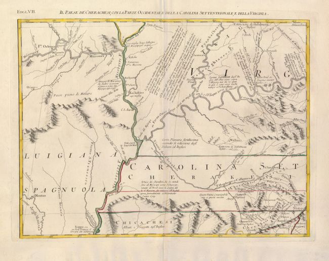 This great regional map provides a detailed view of the Missouri and Ohio Rivers uniting with the Mississippi and adjacent areas. While the map is filled with Indian villages, it shows very little European settlement other than a couple of French forts. It also notes Dr. Thomas Walker's settlement. Walker, a surveyor for the Ohio and Loyal Land Companies, led a small group into the area in 1750 and established a supply post in the area of present-day Barbourville, Kentucky. Drawn from the earliest available English and indigenous surveys, this is the Italian edition of Mitchell's seminal map of the British Dominions in North America that Zatta issued in 12 sections, the whole entitled "Le Colonie Unite dell' America Settentrle." Zatta's maps retain Mitchell's scale, but being smaller, are more legible. Block titling above neatline.