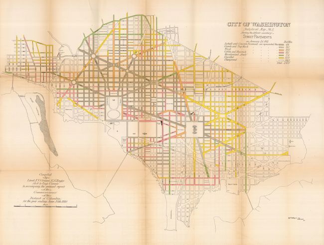 First edition and a complete set of the twelve original Greene maps published to show the large-scale improvements in the infrastructure of the city. These maps were prepared by Capt. W.T. Rossell of the Army's Corps of Engineers to accompany the annual report of the Commissioners, District of Columbia. Each map carries the title "Statistical Map No.__," and is drawn on an identical scale and shows the street pattern of Washington. Each has a specialized focus, e.g. valuation of real estate, street grade, varieties of street pavements, shade trees, sewers, water supply and distribution, street lamps, public schools, police and fire department stations, street railways, scheduled street sweeping, and underground cables. Very interesting details emerge from the maps, e.g., there were 1266 telegraph poles with 30.5 miles of line and 436 miles of wire; New Jersey Ave. was paved with wood and swept once each month. An important and complete set of twelve matched maps in their first edition that provide a remarkable look into the capital's infrastructure in the early 1880's.