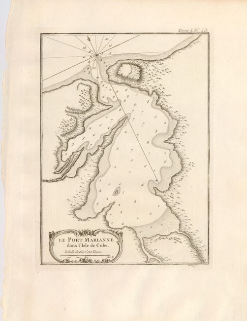 1) Le Port Marianne is a charming engraved map of today's Puerto Mariel. Soundings, rhumblines, fleur-de-lys and a rococo-style title cartouche accent the sheet. From "Le Petite Atlas Maritime", J. N. Bellin, Paris, 1764. (6.5 x 8.7"). Near fine example with bright impression and very wide margins. Wormhole in lower margin, else fine. Grade A.