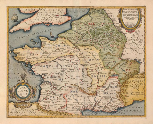 A lovely map of France during Roman times based on ancient geographical sources including Strabo, Plinius, Virgilius, Ovidius and Caesar. The map is filled with detail and ancient place names. Two ships sail in the stipple engraved oceans and the map is decorated with two fine cartouches. Latin text on verso.