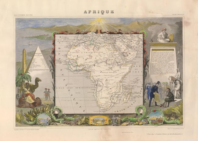 This decorative 19th century map of the continent is colored to show the colonial possessions and major tribal kingdoms. The interior is mostly void of detail, with the exception of the mythical Monts de la Lune, or Mountains of the Moon in the center of the continent. These legendary mountains were long thought to be the source for the Nile, dating back to Ptolemy. Stanley traced a fluvial connection from the Nile back to a mysterious snowy mountain range in Central Africa in 1888, dubbing the mountains Ruwenzori and proclaiming them the Nile source that Ptolemy described. The map is surrounded by steel-engraved scenes by Raimond Bonheur including the pyramids, wild animals, natives, the French army in Algeria and vignettes of Alexandria, Cairo, and Algiers.