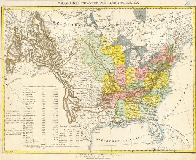 This interesting German map of the United States shows 29 states and 3 districts (Columbia, Missouri, Oregon). It shows the topography and political situation of the country, including the Republic of Texas. The mountains and rivers in the northwest are shown quite graphically. The Great Basin is shown with two large lakes in the vicinity of the Great Salt Lake; from the southern lake a non-existent Rio San Felipe flows to the Pacific Ocean. A numbered key in the lower left is used to name the states and territories, and to give their areas and populations. An unusual feature of interest is the Grosse National Strasse (Great National Road) that is shown running from Washington D.C. to St. Louis.