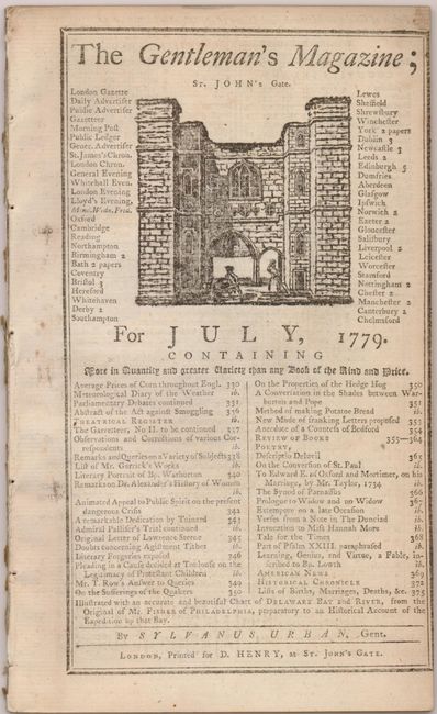 A fascinating Revolutionary War map based on the chart Joshua Fisher made of Delaware Bay in 1756 and expanded upon in 1776. The Fisher map was the most important map of the bay and river in the eighteenth century. This chart was derived from the 1776 edition, and was published with an article updating the British public on the war in the colonies. It shows the bay and beyond to Philadelphia. It is filled with place names and locates many hazards to navigation along the waterway. A compass rose orients north to the right. Still bound into the original edition of The Gentleman's Magazine, July, 1779.
