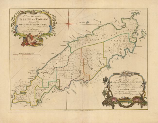 An extremely rare map of Tobago, later copied by William Faden. The island is shown in seven divisions, including Sandy Point, Rockly Bay, Courland, Barbados Bay, North East, Great River, and Queen's Bay. The map names the Buccoo Reef and Bay, Minister Bay, and the capitol of Scarborough. The map is graced with a pair of extravagant cartouches in Kitchin's distinctive style. The first is surrounded by an ornate border attended by Neptune; the lower cartouche contains a dedication to Thomas Pye by Joshua Rhodes, topped with windheads and surrounded with shells and nets. Sold by Joshua Rhodes at Twickenham, and Thomas Kitchin in London.