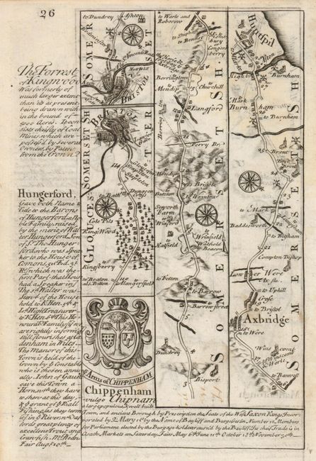 1) Marlborough to Marshfield, features text on Newbury and Calne. Verso, Bristol to Axbridge, with information on the Forrest Kingwood, Hungerford, Chippenham.