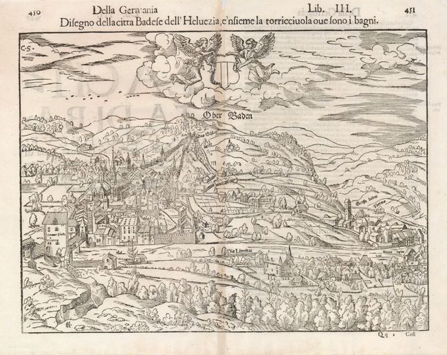 Dramatic woodcut map of Baden drawn from a bird's-eye perspective. A pair of angels support the crest of the town above the map. Many farms and houses are noted in the surrounding countryside. Italian text on verso.