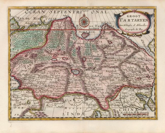 Attractive map of Siberia, northern China, and Korea, which is shown here as an island. The cities, mountains, forests and rivers are well-detailed. Siberia still reflects some of Ptolemy’s conceptions with the Island of Tazata and the Cape of Tabin in the extreme north. The map is decorated with a lovely title cartouche as well as a beautiful compass rose. Engraved by Antoine d'Winter for a Dutch edition of Sanson's small atlas.