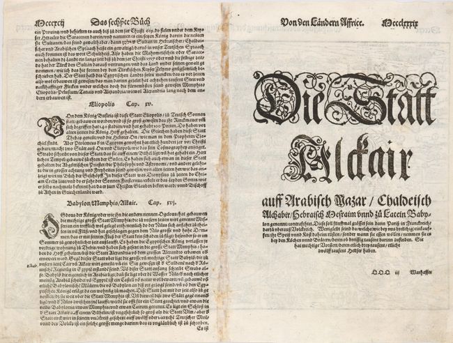 This early, 16th century woodblock city plan of Cairo has amazing detail of the buildings, gardens, temples, palaces, farms and markets. The Nile is shown with fishing boats, irrigation systems and even crocodiles. The pyramids are also depicted. Title is printed on verso.