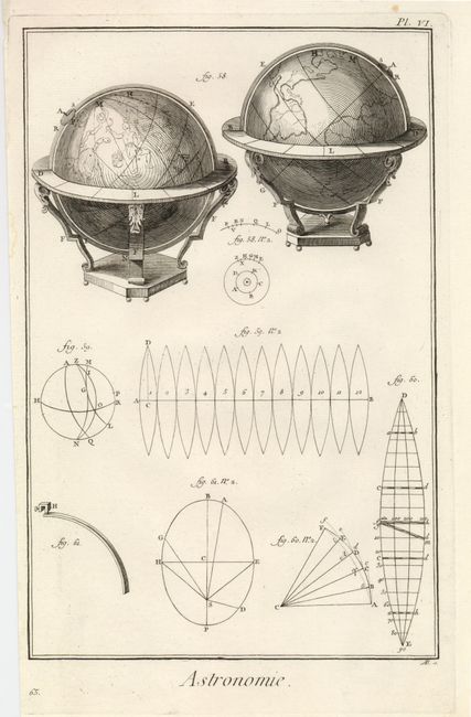 1) Pl. VI depicts a celestial and terrestrial globe, with mathematical figures below.