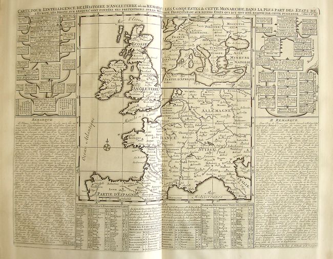 This French thematic atlas focuses mainly on Great Britain, but also includes information on Switzerland , France, Savoy, Lorraine and the Republic of Venice. There are 13 copper engraved double page folding maps and 17 double page engravings that serve as chronological and genealogical tables. These tables are embellished with numerous vignettes of local inhabitants and related maps. The maps are decorated with numerous portraits of the British Monarchy through the centuries and the coats-of-arms of influential families. Contemporary brown calf covers with gilt embossed edges and spine. This complete folio atlas includes both text title pages, one printed in red and black. The third title page is a handsome engraved view that is filled with allegorical figures including women, geographers, heraldry, soldiers, ships and a winged lion. It was designed by the renowned Dutch artist Romain de Hooghe and engraved by Sluyter. Very nice original binding in brown calf with gilt and tooling along edges. The spine has raised bands with gilt title. A beautiful, complete example.