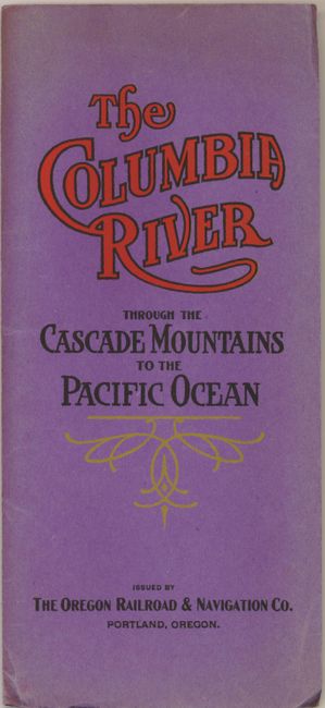 This is a fabulous birds-eye-view of the Columbia River published to celebrate the Lewis and Clark Centennial Exposition in Portland, Ore. The view of the lower Columbia River extends from Arlington to the Pacific Ocean. The map has superb topographical detail, and includes the names and elevations of the area's main mountains; St. Helens, Hood and Adams. The cities on the map have good grid detail, showing buildings, parks and train stations. A pair of colorful, nicely engraved vignettes of Mt. Hood (Eliot Glacier and Cloud Cap Inn) help make this a visually stunning example. Numerous beautiful black and white photographs illustrate the informational text on verso. Produced by the Oregon Railroad and Navigation Co. the map folds into purple covers with red and black text in an Art Nouveau design. A handsome and scarce issue.