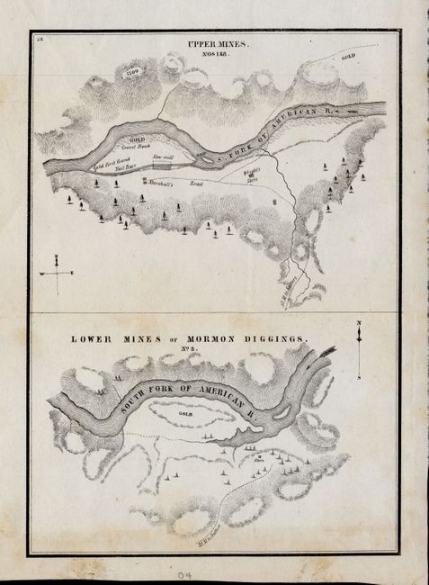 1) Upper Mines. Nos 1 & 8 / Lower Mines or Mormon Diggings. No. 3 is one of the earliest printed maps to actually name and locate gold discoveries in California. The Upper Mines are along the South Fork of the American River and show where James Marshall first found gold. The lower map depicts numerous tents surrounding a store with a large area of the bar marked GOLD.