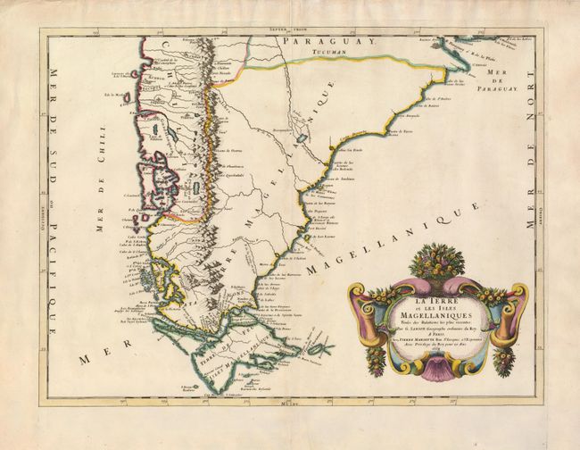 An uncommon map of Patagonia, southern Chile, and Tierra del Fuego. Buenos Aires and the mouth of the La Plata are in the northernmost part of the map. The Andes are shown pictorially, and eleven volcanoes are noted and named. The Desaguadero River is located, showing a tentative watershed and lake. The title cartouche is festooned with fruit amidst rococo curves.