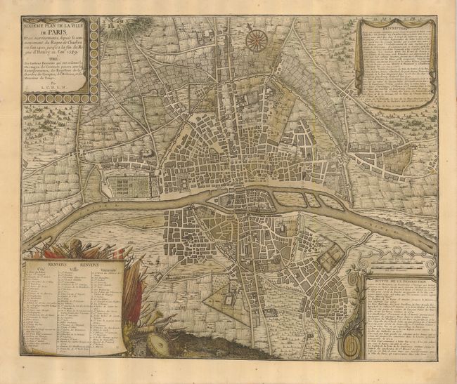 Very attractive and uncommon plan of the city with excellent detail of the surrounding countryside. The plan was intended to show the development of Paris, and uses a series of dotted lines to show the location of the city's northern walls at earlier times, during 1422 and 1589. A legend surrounded with the accoutrements of war at lower left lists churches, schools, hospitals, hotels, and other important landmarks. One of eight plans from Nicolas Delamare's Traite de la police, a well known treatise on city administration. Drawn and engraved by A. Coquart (1668-1707).