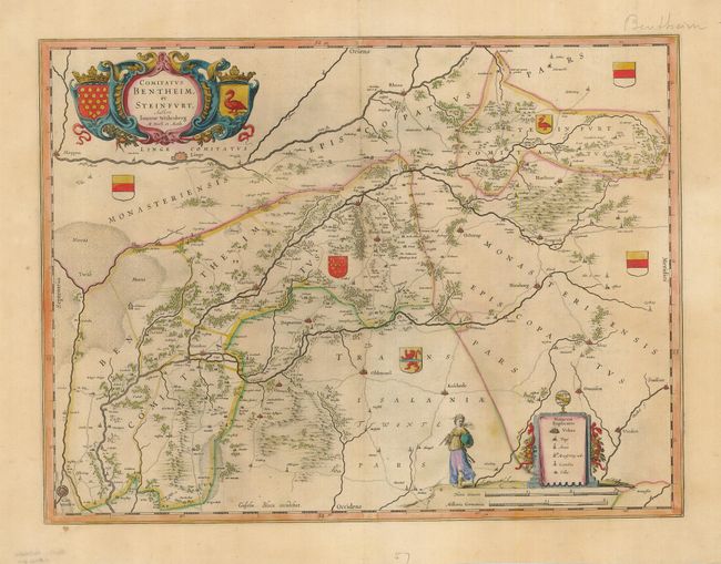 A fine map of the districts of Bentheim and Steinfurt in Lower Saxony. This finely engraved map illustrates rivers, roads, mountains, forests, cities and towns. The title cartouche is ornamented with two coats of arms and the map is further embellished with a lovely female figure, a decorative key and six small heralds, with three that are blank. French text on verso.