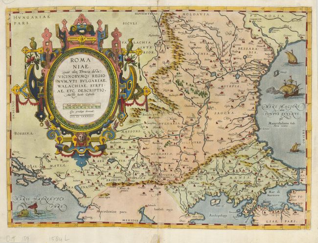 Stunning map of the classical region of Thrace, with most of present-day Bulgaria and Romania. It encompasses the southern Balkans from the Sea of Marmara to the Bosphorus, along the western shore of the Black Sea to the mouth of the Danube River. Ortelius based the map in part on the work of Jacob Gastaldi. Beautifully decorated with a most elaborate title cartouche, ships and sea monsters. Latin text on verso and the page number 89, indicating it was published in the 1584 edition of the Theatrum Orbis Terrarum.