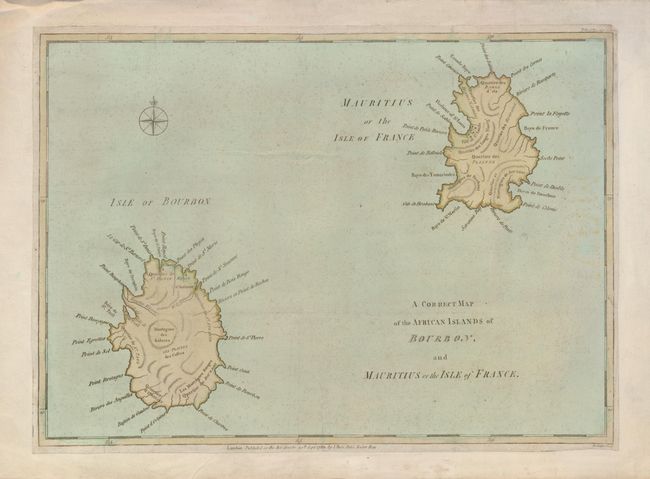 Elegant rendering of the islands of Mauritius and Reunion in the south Indian Ocean. Reunion Island is named as Bourbon Island, after the French royal family. This was changed to Reunion in 1793 after the fall of the royal house. The map is filled with information on the bays, topography and the few towns that were located there at the time. This was included in the September 30th, 1781 publication of Political Magazine, published by John Bew.