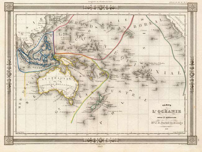 Very handsome, precisely engraved map with bright outline color and a beautiful frame-style border. This is plate V from Barbie du Bocage's Atlas that was engraved by C. Smith and published by Maison Basset. The map covers nearly the entire Pacific Ocean, from Japan and the Korean Peninsula, across to include part of North America, and south to just past New Zealand at about 60° Longitude. Colonial holdings shown via outline coloring.