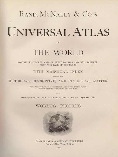 Complete atlas with 78 single-page and 44 double-page maps. All double-page maps are printed on two sheets. This is a world atlas, but the majority of the maps are of U.S. interest, including all states and territories and numerous city plans. The atlas is illustrated with dozens of black and white photographs interspersed throughout the text, including presidential portraits and a facsimile of the U.S. constitution. Title, introduction, table of contents, text and maps, 456pp., plus an exhaustive 94 page listing of towns and counties for each state. Hardbound in original burgundy cloth covers with silver title on front.