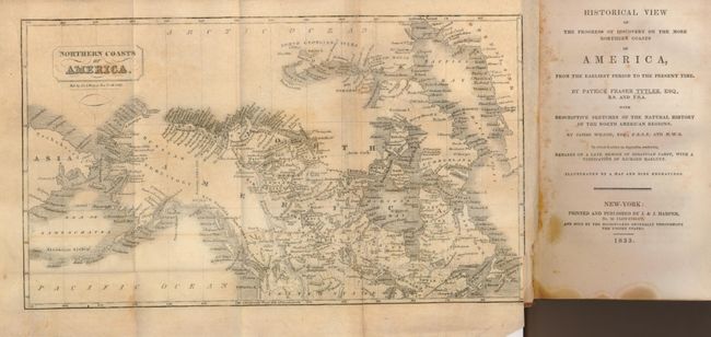 An enjoyable read featuring the accounts of numerous voyages to North America including those of Cabot, Verazzano, Cortes, Viscaino, Bering, Cook, and Vancouver. The book contains several chapters describing the flora, fauna and geology of North America. The frontise is a folding map titled the Northern Coasts of America, J. & I. Harper, uncolored, 1833 (9.5 x 5.5"). The map is printed on banknote paper and shows topography, Indian tribes and numerous place names. There is a good amount of detail of Baffins Bay and the North Georgian Isles that are only partially delineated. Alaska is Russian Territory. An appendix details the "remarks on a late memoir of Sebastian Cabot, with a vindication of Richard Hakluyt." This first American edition contains eight of the nine engraved illustrations listed, with the vignette of "Mount Coplestone, or western Termination of the Rocky Mountains" missing. Engravings by Jackson include a portrait of Hernan Cortes; Grizzle [sic] Bear; American Gray Wolf; American Black Elk; Rocky Mountain Goat and Sheep, and three more. Written by Patrick Fraser Tytler with descriptive sketches of the Natural History of the region by James Wilson. 360 pages. Hardbound in original paper covered boards with printed title on front and spine.