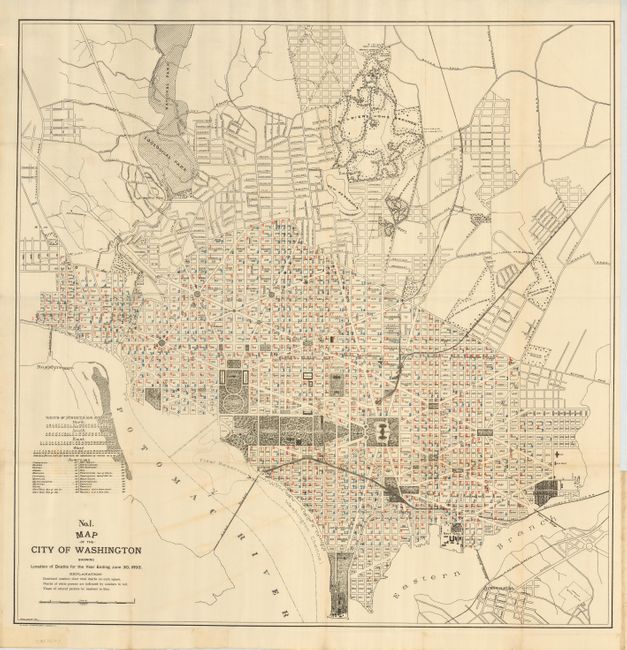 Interesting series of thematic maps that provide detailed statistics and other information on public health and the infrastructure of the captial city in the mid-1890's. The maps are after the original Greene maps first published in 1880-81 to show the large-scale improvements in the infrastructure of the city. The first six maps use the same base map with overprinting to emphasis its theme. The title of each begins "Map of the City of Washington Showing..." The first three are related to public health: Location of Deaths for the Year ending June 30, 1893; Location of Fatal Cases of Zymotic Diseases…; and Location of Fatal Cases of Lung Disease…. Legend and coloring locate the numbers of deaths of whites, noted in red, and non-whites in blue. The next maps focus on infrastructure: Water Mains; Sewers; and The Varieties of Street Pavement. The pavement map is most colorful as it uses seven bright colors to indicate various street surfaces such as Asphalt and Coal, Granite, Vitrified Brick, etc. The final map is a "Map Showing Suburban Subdivisions of the District of Columbia To accompany the Annual Report of the Engineer Department, D.C., Jan.. 1894." This map is mostly black and white with green overprinting to highlight parks, observatories, institutes, asylums, the Soldier's Home, and other government facilities.