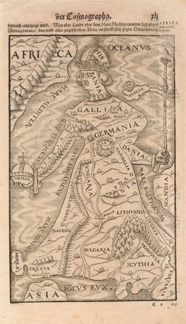 This is one of the most famous of cartographic oddities, showing Europe in the shape of a woman. The representation of Europa Regina or Queen of the World was first drawn by Johannes Bucius in 1537. This simplified version appeared in several editions of Munster's Cosmography from 1580 onwards. West is shown at top with Spain forming the crown and head, France and Germany the neck and bust, Italy the left arm and Denmark the right arm holding a scepter with Britain as the flag. The remainder of the figure is a flowing robe with Greece and Russia at the feet. It has been argued that instead of a woman, the map represents Charles V of Spain, modeling a Europe that had Spain as its crown. Whatever the source, this is an extraordinary example of the art of mapmaking. German text on verso.