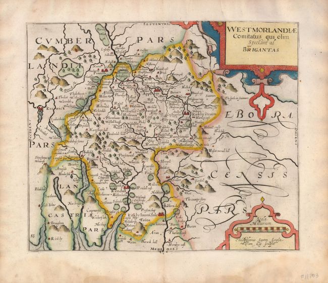 An early map of the county of Westmoreland engraved by William Kip and based upon the famous survey by Christopher Saxton. It is fully engraved to illustrate all the salient features of the county including market towns, forests, parks, hills and bridges. Decorated with large strapwork title and scale cartouches.
