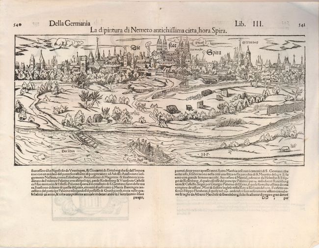 This early view of the city of Speyer illustrates the profile of the town from the Rhine River. The Speyer Cathedral is shown in all its imposing glory, with S. Widnberg and S. German on either side. In the foreground, a group of hunters are being ferried across the Rhine atop their horses. Italian text on verso and below the map.