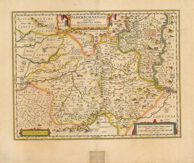 This fine map of the area around Paderborn in Westphalia was produced by Joannes Gigas (Gigante). It covers the region from the Weser River in the east, Warburg in the south, and reaches to Lippe in the west. Small coats of arms identify the gentry of the region and three decorative strapwork cartouches adorn the map. This was one of the plates that Blaeu obtained from the estate of Jodocus Hondius in 1629. Blaeu deleted Hondius' name and added his own to the imprint at lower left. Latin text on verso.
