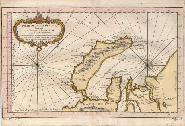 Nicely colored group of copper engraved maps covering Novaya Zemlya and the Asiatic part of Russia. Mountains, rivers, deserts, roads and villages are well delineated. 1) Partie de la Mer Glaciale Contenant la Nouvelle Zemble et le Pais des Samoiedes (13.5 x 8.3"); 2) Suite de la Carte de la Siberie et le Pays de Kamtschatka (10.3 x 9.3"); and 3) Carte de la Tartarie Orientale (12.3 x 8.2").