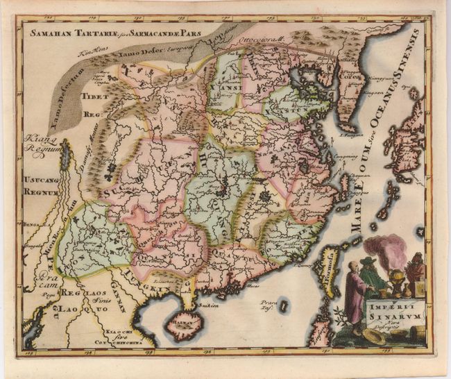 Handsome small map based on the important Martini/Blaeu map of the Chinese Empire. It shows a fair number of provinces and cities named in the interior. The Great Wall is depicted along the northern border. A large fictitious interior lake labeled Kia Lacus is the source of five large, southern rivers. The map extends to include Formosa, Korea and parts of Japan and Laos. The title cartouche depicts a Jesuit with a Chinese nobleman and warrior and a large incense pot.