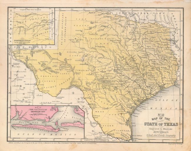 A nice example of Mitchell's famous school atlas with 32 maps (on 18 sheets) along with tables and statistics. The map of the United States features large western territories and the Pre-Gadsden purchase border with Mexico. The map of the Gold Region in California, inset into the map of the U.S., contains the names of numerous important gold mining towns in central California. The atlas also includes a nice map of Texas. Hardbound with pictorial paper over boards. This is the fourth revised edition, published by Cowperthwait, Desilver & Butler.