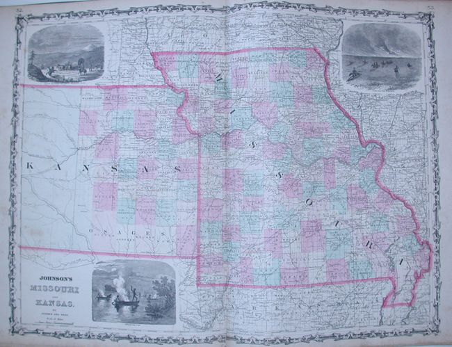 This complete transitional atlas contains 59 beautifully rendered, steel engraved maps with hand color and bright, crisp impressions. There are several thematic maps and diagrams interspersed throughout the text that display the geology, weather, tides, agriculture and animal kingdoms of the world. The maps include 28 single page and 31 double page maps. This 1863 edition is the last year with steel engraved plates and the version in which many of the maps feature vignettes. All maps have the early strap work style borders. This atlas also features the New Military Map of the United States. This is the more desirable military map as it shows all state and territory boundaries rather than the limits of military divisions. The Southwest map shows Arrizona in the southern part of New Mexico Territory. This is thought to represent the Confederate Territory of Arizona that existed for nearly a year from August 1861 until July of 1862. The Confederate General Baylor appointed himself the territorial governor and claimed all of New Mexico Territory south of the 34th parallel. In the southern part of Arizona is the "Gadsden Ten Million Purchase of Mexico." The Utah/Nevada border follows the 116th meridian. Filled with historical notes and two interesting notations. One note in the area of Quartzite, Arizona refers to the area as being "exceedingly fertile and abundantly timbered and well watered." Details the U.S. Mail routes, the Emigrant road to California, the proposed railroad route through Utah, Nevada and California, and the Pony Express trail. A fine double page map of Texas and the uncommon map of the northwest showing Washington in its transitional configuration as an inverted "L" prior to the formation of Idaho Territory. Nebraska is shown with the long panhandle extending westward into today's Wyoming. Folio. Original hardbound in quarter leather and green cloth. Gilt titles on cover and spine. Laying in loose at front is a bonus map: "Johnson's Washington Oregon and Idaho" is circa 1864 and shows the newly created Idaho in an indistinct configuration with only three counties shown in the north. (A) Complete atlas with some desirable maps.