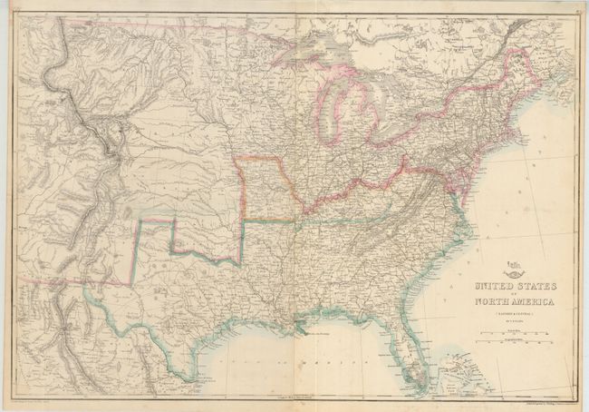 This great Civil Warmap covers the country from the Rocky Mountains to the Atlantic seaboard. Of importance is the designation of the separate Confederate and Union states via hand coloring. The states of Missouri and Kentucky are colored differently to indicate their status as border states containing both pro-Confederate and pro-Union government factions. The Confederate Territory of Arizona is shown in the south of New Mexico Territory. The map is finely engraved and detailed, and it shows existing railroads and several possible routes explored for the proposed Pacific Railroads. The tracks of Fremont, Gunnison and others are shown, as are numerous roads, marshes, forts and Indian tribes. These maps were published in the serial Weekly Dispatch Atlas for later binding into a world atlas, and examples still folding and unbound are uncommon. Published by Cassell, Petier & Galpin, la Belle Sauvage Yard, Ludgate Hill for inclusion in the Weekly Dispatch Atlas.