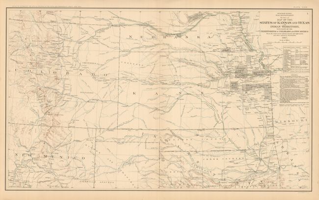 This is Plate CXIX. It covers all of Kansas, most of Colorado and parts of Nebraska, New Mexico, Texas and Indian Territory. It is filled with information on forts, Agencies, wagon roads, exploration routes, railroads, and much more. The topography is shown via hachure and the waterways are in blue. There is excellent detail of Denver with the mountains and mining communities to the west. Extensive list of Authorities and Astronomical Notes. Dated 1867 but published 1892.