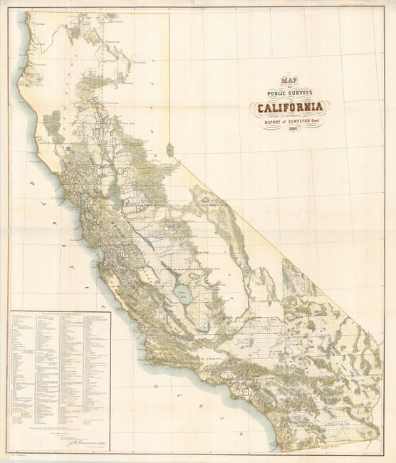 This large and detailed map delineates the progress of public surveys throughout the state. About one-third of the state, in the north and east, remains unsurveyed. A large inset lists 340 "Private Grants finally surveyed" plus three Indian Reservations (Nome Lackee, Nome Cult and Sebastian).