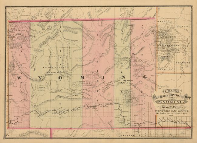 Rare map from the first edition of Cram's most celebrated atlas. This large double-page map has excellent detail throughout, locating scores of towns and villages, forts and Indian reservations. The extensive watershed is delineated and the topography is shown via hachure. The nascent railway system extends only to Bismark from Fargo, and in the south a short line to Yankton. Future rails are shown via dotted lines. On the verso is a great map of Wyoming Territory which has only five counties; also Vermont/New Hampshire. The map is dated 1879 with a copyright date of 1878. The imprint is Cram's Western Map Depot, 66 Lake St. Chicago, Ills. There was a close relationship between the Cram and Watson firms, who also published from this address. This Lake Street address was the home to Cram's publishing company between 1873 and 1879, thereafter moving to Wabash Avenue. These maps were published back to back and there is an equally fine single page map of Wyoming on the verso. This edition, unrecorded in Blevins, is two years earlier than Blevins #445. Five counties make up the entire territory, namely Uintah, Sweetwater, Carbon, Albany and Laramie. In 1875 Pease (renamed to Johnson in 1879) and Crook counties were established, but neither appear on this map.