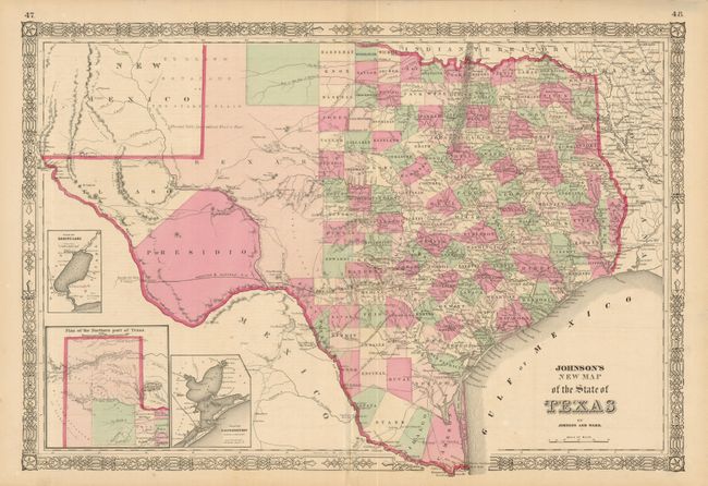 Large, handsome map with county development mostly in eastern Texas and only the three large counties of El Paso, Presidio, and Bexar organized in the west. The panhandle, noted as the Staked Plains (Elevated Table Land, without Wood or Water), includes a large section that is unorganized. Nice depiction of the wagon roads, many named, and several completed railroads. Insets include a Plan of Sabine Lake, Plan of the Northern part of Texas, and Plan of Galveston Bay. Decorative latticework border. Text on verso. Fancy title lettering.