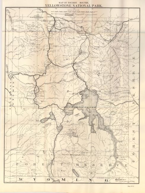 3) Map of Tourist Routes, Yellowstone National Park, U.S. Army, Washington D.C., 1900, (13.5 x 17.5"), b/w. This is the map a tourist would have seen in 1900. It show the entire park with all roads, geyser basins and other information important to the visitor. Legend further identifies Old Wagon Roads, Bridle trails, and more. From Capt. H.M. Chittenden's report of 1900.