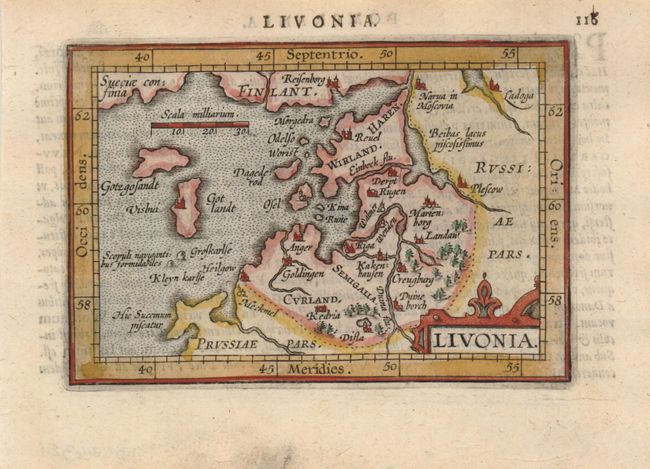 Delightful little map of Estonia and Latvia depicts forests, rivers and major cities. Nice strapwork cartouche. The map was engraved by the brothers Ambrose and Ferdinand Arsenius who had been assistants to Frans Hogenburg and co-engravers of Ortelius' folio Theatrum. This series of maps was accompanied by text by Michel Coignet and was published by Jan B. Vrients. Latin text on verso.