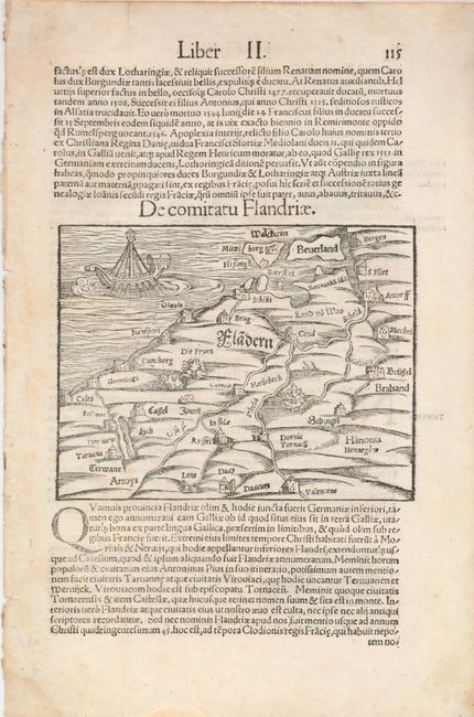 Beautiful woodblock map of the region of Flanders filled with mountains, rivers, forests and towns. The map names Dunkerque (Dunckerg), Artois and many other places, while a Viking longboat sails the sea. On a full sheet of (8 x 12") with Latin text.